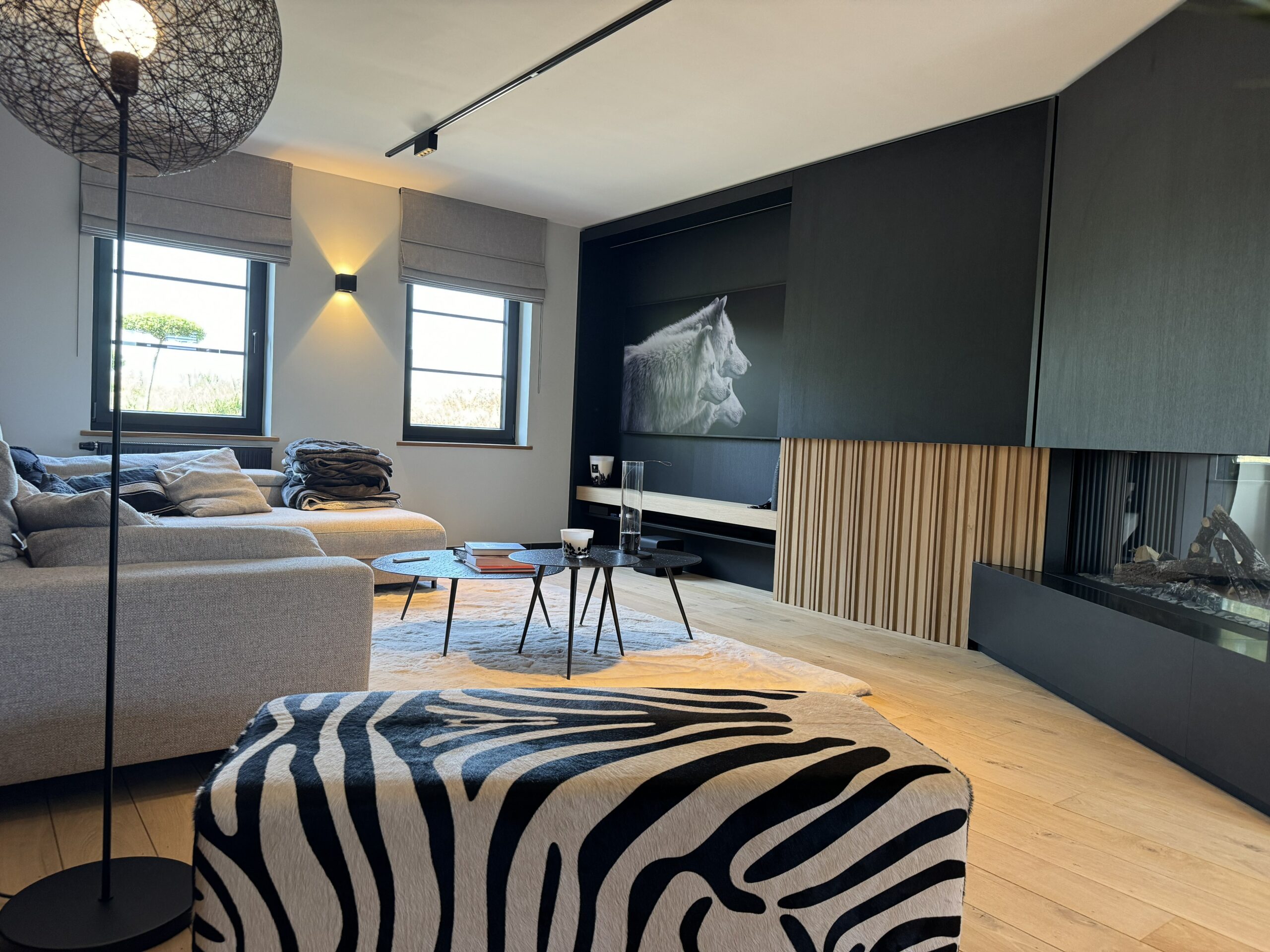 * salon cosy avec plancher massif et foyer gaz design